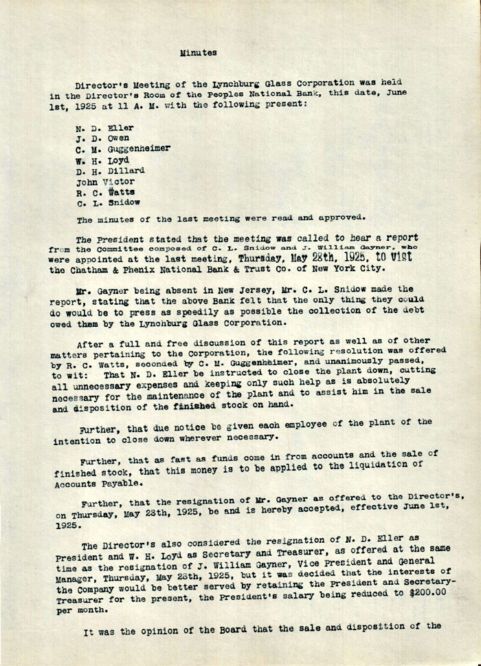 Director's Meeting of the Lynchburg Glass Corporation was held in the Director's Room of the Peoples National Bank, this date, June 1st, 1925 at 11 A. M. with the following present: