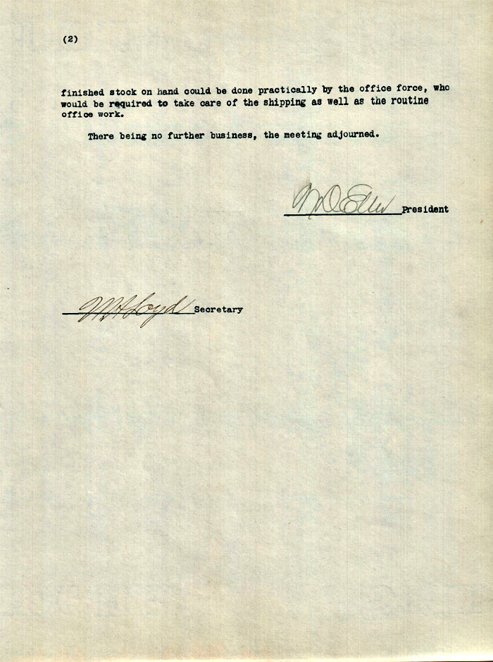 After a full and free discussion of this report as well as of other matters pertaining to the Corporation, the following resolution was offered by R. C. Watts, seconded by C. M. Guggenheimer, and unanimously passed, to wit: That N. D. Eller be instructed to close the plant down, cutting all unnecessary expenses and keeping only such help as is absolutely necessary for the maintenance of the plant and to assist him in the sale and disposition of the finished stock on hand.