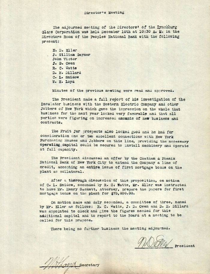 The adjourned meeting of the Directors' of the Lynchburg G1ass Corporation was held December 16th [1924] at 10:30 A. M. in the Directors Room of the Peoples National Bank with the following present: