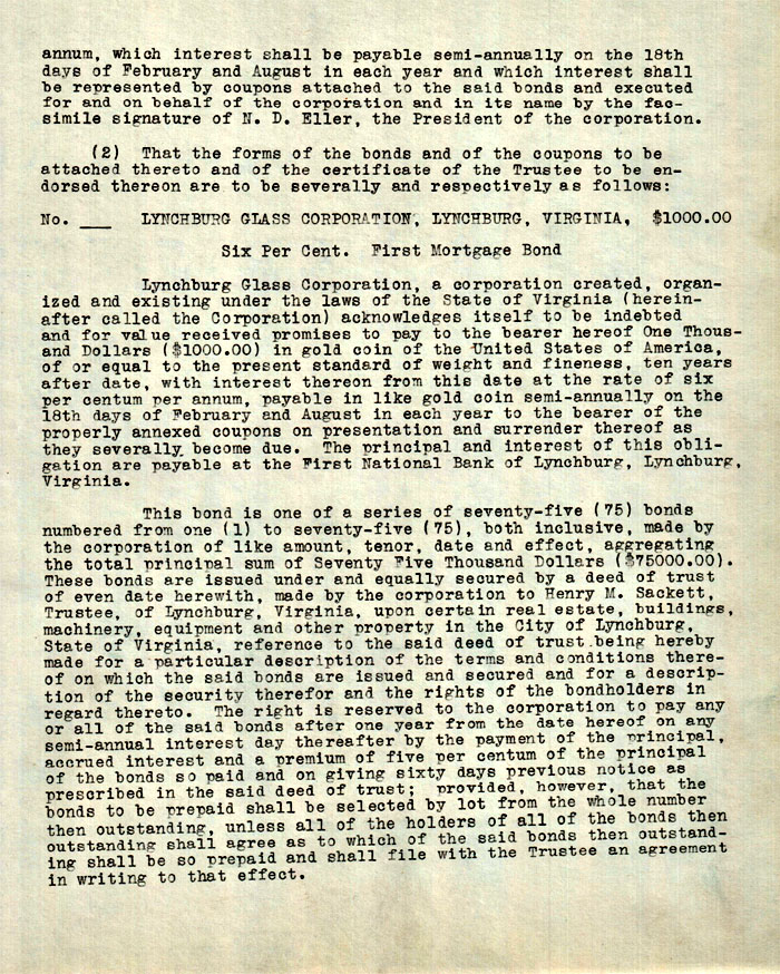 Lynchburg Glass Corporation, a corporation created, organized and existing under the laws of the State of Virginia (hereinafter called the Corporation) acknowledges itself to be indebted and for value received promises to pay to the bearer hereof One Thousand Dollars ($1000.00) in gold coin of the United States of America, of or equal to the present standard of weight and fineness, ten years after date, with interest thereon from this date at the rate of six per centum per annum, payable in like gold coin semi-annually on the 18th days of February and August in each year to the bearer of the properly annexed coupons on presentation and surrender thereof as they severally become due. The principal and interest of this obligation are payable at the First National Bank of Lynchburg, Lynchburg, Virginia.