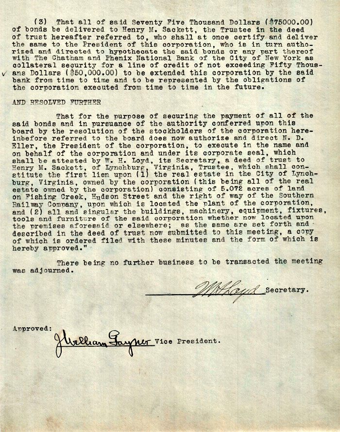 That for the purpose of securing the payment of all of the said bonds and in pursuance of the authority conferred upon this board by the resolution of the stockholders of the corporation hereinbefore referred to the board does now authorize and direct N. D. Eller, the President of the corporation, to execute in the name and on behalf of the corporation and under its corporate seal, which shall be attested by W. H. Loyd, its Secretary, a deed of trust to Henry M. Sackett, of Lynchburg, Virginia, Trustee, which shall constitute the first lien upon (1) the real estate in the City of Lynchburg, Virginia, owned by the corporation (this being all of the real estate owned by the corporation) consisting of 5.072 acres of land on Fishing Creek, Hudson Street and the right of way of the Southern Railway Company, upon which is located the plant of the corporation, and (2) all and singular the buildings, machinery, equipment, fixtures, tools and furniture of the said corporation whether now located upon the premises aforesaid or elsewhere; as the same are set forth and described in the deed of trust now submitted to this meeting, a copy of which is ordered filed with these minutes and the form of which is hereby approved."