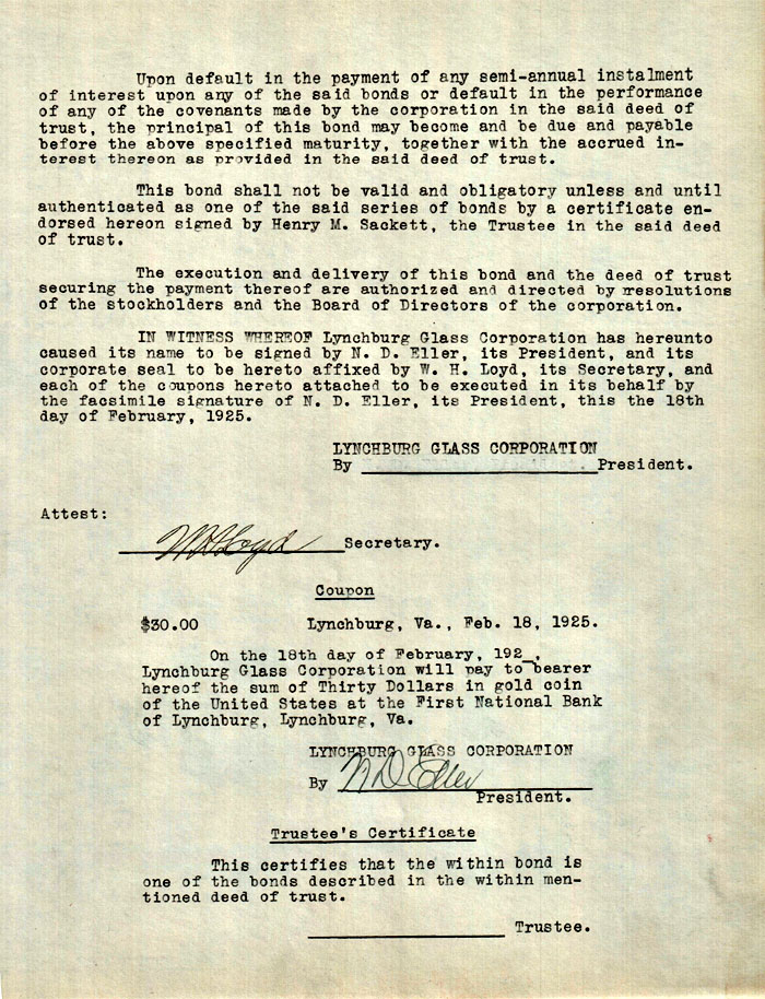IN WITNESS WHEREOF Lynchburg Glass Corporation has hereunto caused its name to be signed by N. D. Eller, its President, and its corporate seal to be hereto affixed by W. H. Loyd, its Secretary, and each of the coupons hereto attached to be executed in its behalf by the facsimile signature of N. D. Eller, its President, this the 18th day of February, 1925.