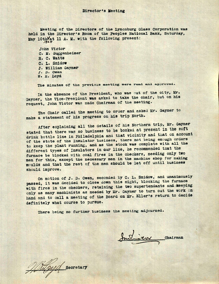 Meeting of the Directors of the Lynchburg Glass Corporation was held in the Director’s Room of the Peoples National Bank, Saturday, May 10th [handwritten: 1924] at 11 A. M. with the following present: