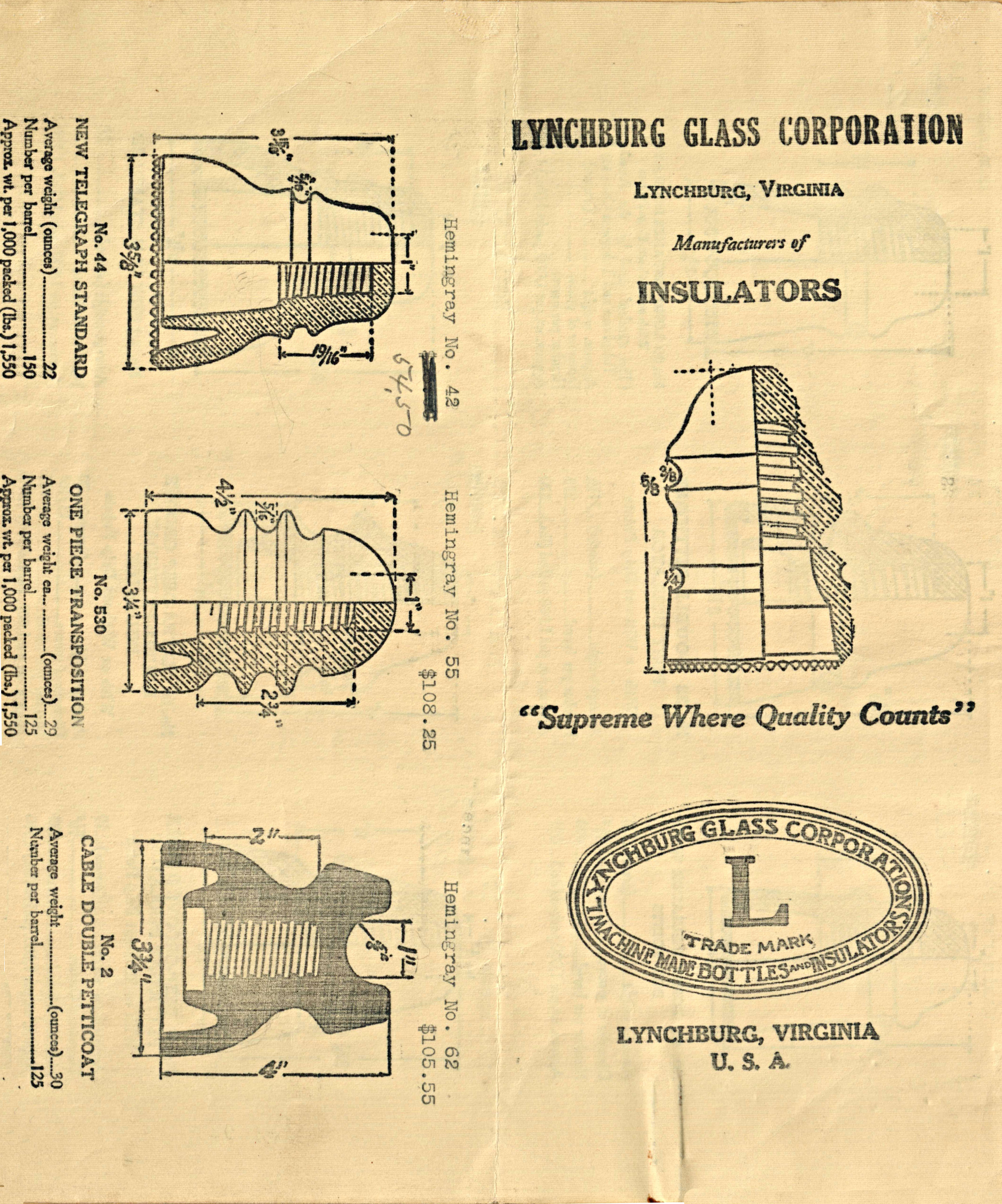 This is the first of only two known product "catalogs" used by Lynchburg. It is a single sheet of paper printed on both sides folded to fit into a standard business envelope (see photos below). The front contains the company name, slogan, and logo, while the rest includes cut-away illustrations of the available insulators with dimensions, approximate weight, number packed per barrel, and packed weight per thousand. Prices were made available on a separate sheet.