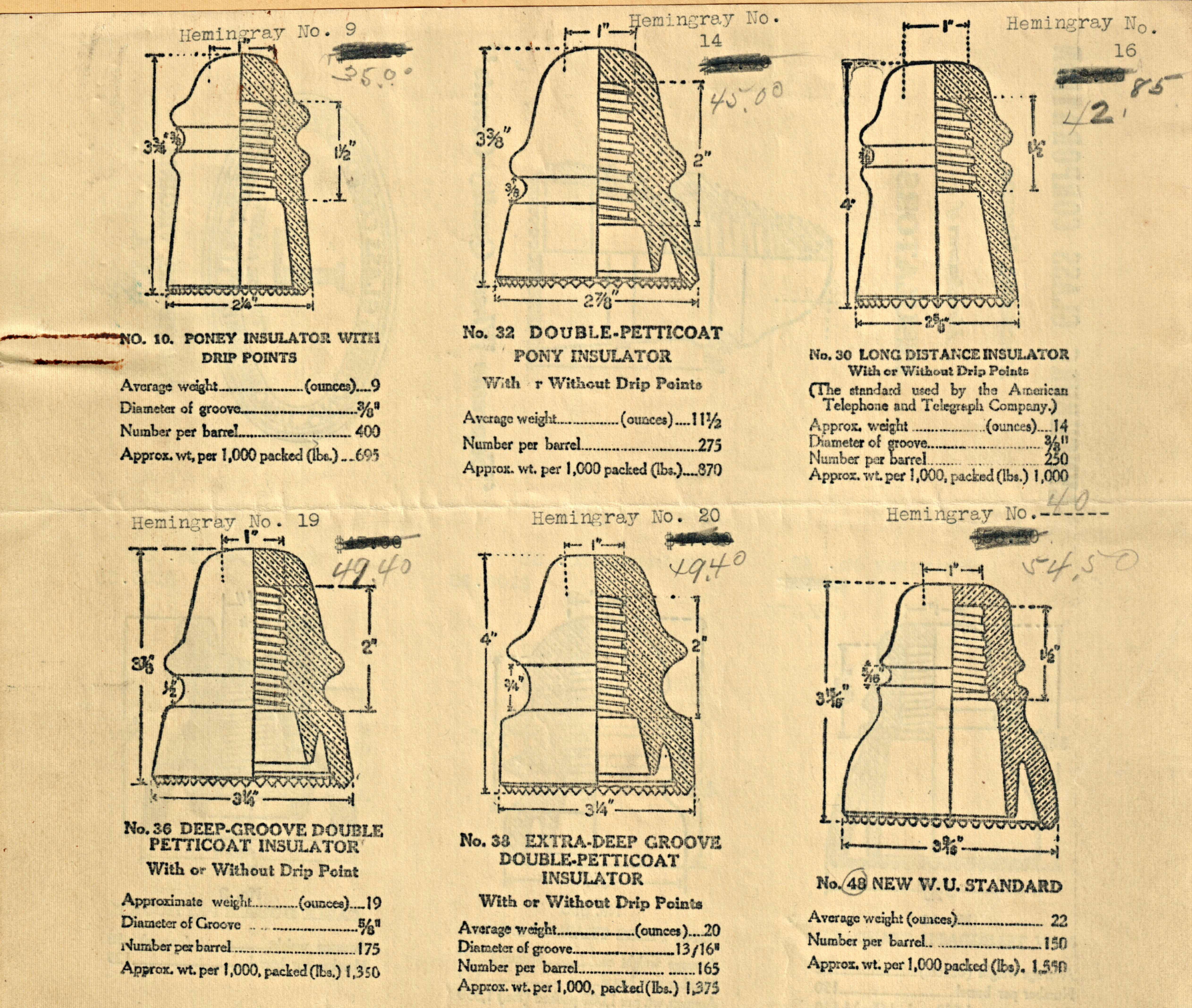 While most of these insulator styles were offered either with or without drip points, it is interesting that the No. 10 (CD 106) is only listed with drip points. Even though No. 32 (CD 160) was listed as available without drip points, none are known in smooth base. The first production run of No. 32 is listed in the records as a No. 140. It is also interesting to note that the No. 10 is called a "poney" insulator. This is likely a typographical error since the No. 32 (CD 160) is labeled a "Double Petticoat Pony Insulator." A later flyer refers to the No. 10 as a "pony" insulator.