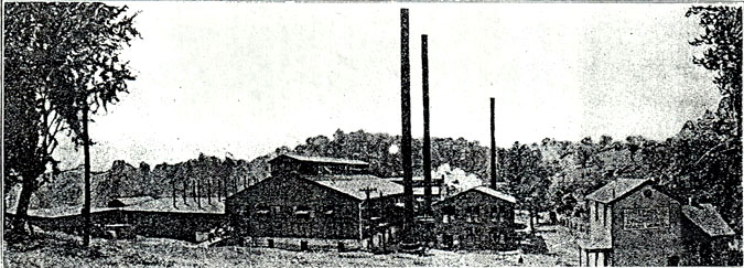At far left is the office building. To the right of this is the batch house. In the center foreground is the gas producer house (the boiler house is hidden behind the tree). In the center background is the part of the plant that housed the annealing lehrs (the main building is hidden), with the railroad trestle that supplied the batch house with raw materials, as well as the oil tank. To the right, the roof of the box shop is visible. This photo reveals that it was the south furnace that was in production (middle smoke stack, the right stack is for the gas producer); the other furnace was never used by either company. Photo courtesy of Mitch Zoll, great great grandson of E. J. Gayner, who was treasurer at Gayner Glass Works when J. William Gayner was vice president (1916).